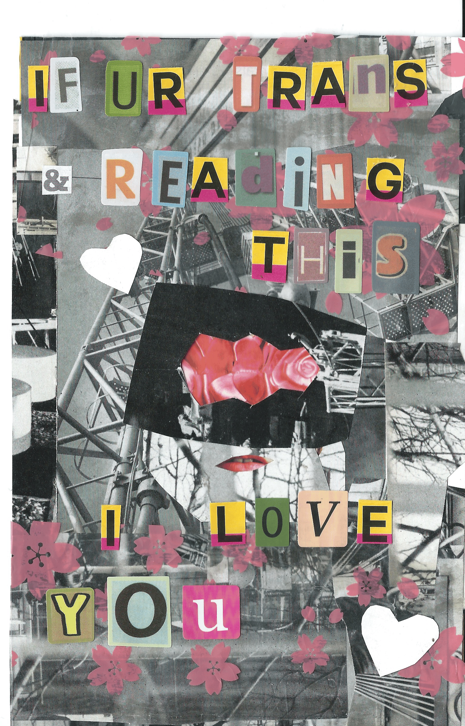 Image is a collage made (partially, within copright laws lol) from a book by a notorious transphobic academic - I *liberated* the book from its shelf and made it into a message of trans joy. This is our future, building something better on top of the ruins of their hate.
